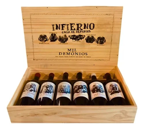 Estuche por 6 vinos de la linea Mil Demonios de bodega Sin Reglas: 1 Mil Demonios Malbel 1 Pirata Mil demonios Cabernet Sauvignon 1 Calchaqui Mil Demonios Tannat 1 Lucifer Mil Demonios Assemblage 1 Vikingo Mil Demonios Corte de Petit Verdot 1 Gitano Mil Demonios Blend